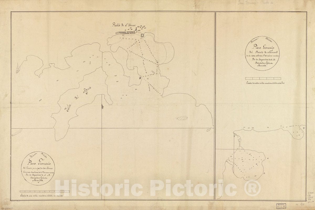 Historic 1793 Map - Plano geométrico del Puerto Principal de San Tomas en la Costa meridional de la ya. del mismo nombre ; Plano geométrico del Puerto de Normand en la Costa N.O. de la ya.
