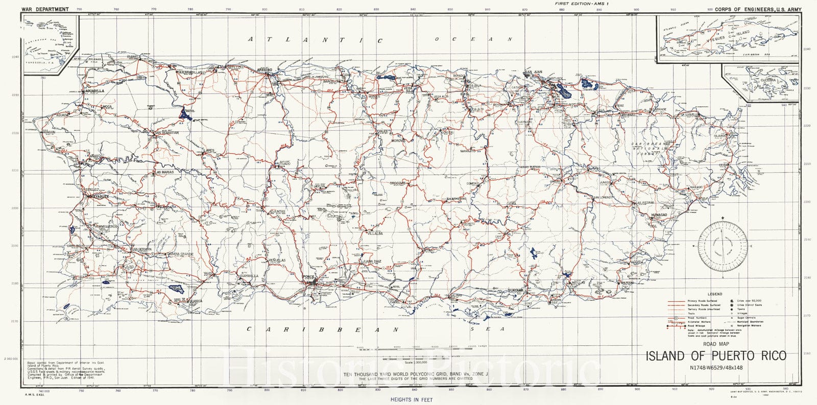 Historic Map : 1943 Map of the Island of Puerto Rico Showing Highways, Roads and Railroads : Vintage Wall Art
