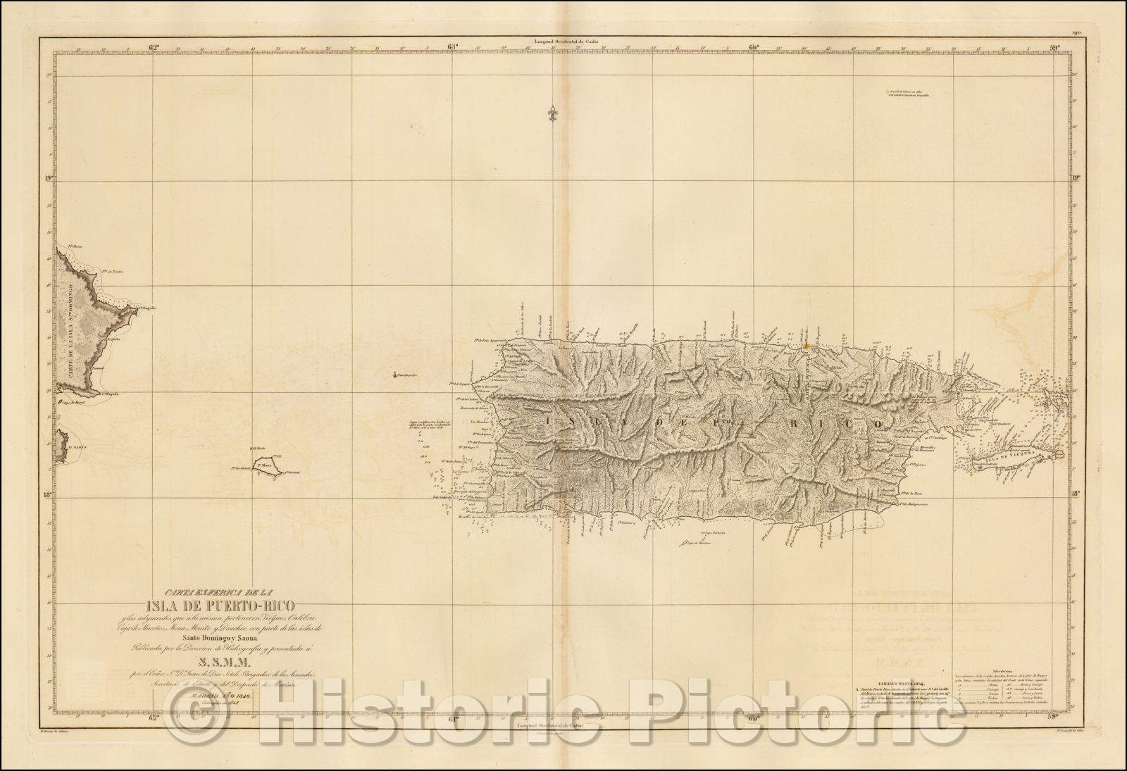 • .Historic Map - Carta Esferica De La Isla De Puerto-Rico y las adyacentes, Vicques, Culebra, Cajades Muertos, Mona, Monito y Desecho, 1840 - Vintage Wall Art
