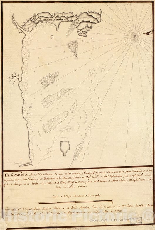 Historical Map, 1783 El Guarico, Alias, el cavo Frances, ES UNA de las colonias y puertos qe. poseen Los Franceses en la Parte Occidental de la Ysla EspanIÆ’ola, Vintage Wall Art