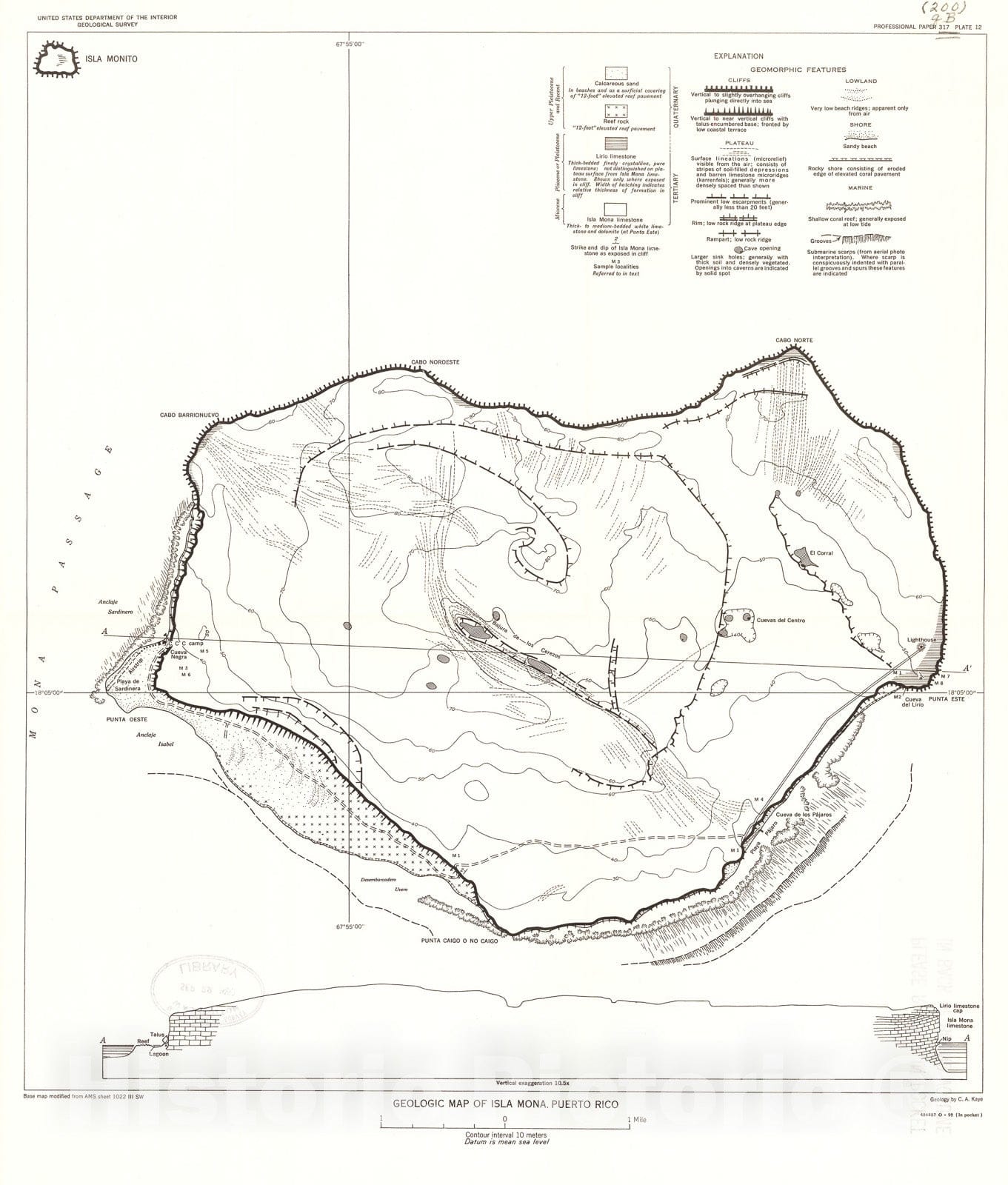 Map : Geology of Isla Mona, Puerto Rico, and notes on age of Mona Passage with a section on the petrography of the phosphorites, 1959 Cartography Wall Art :