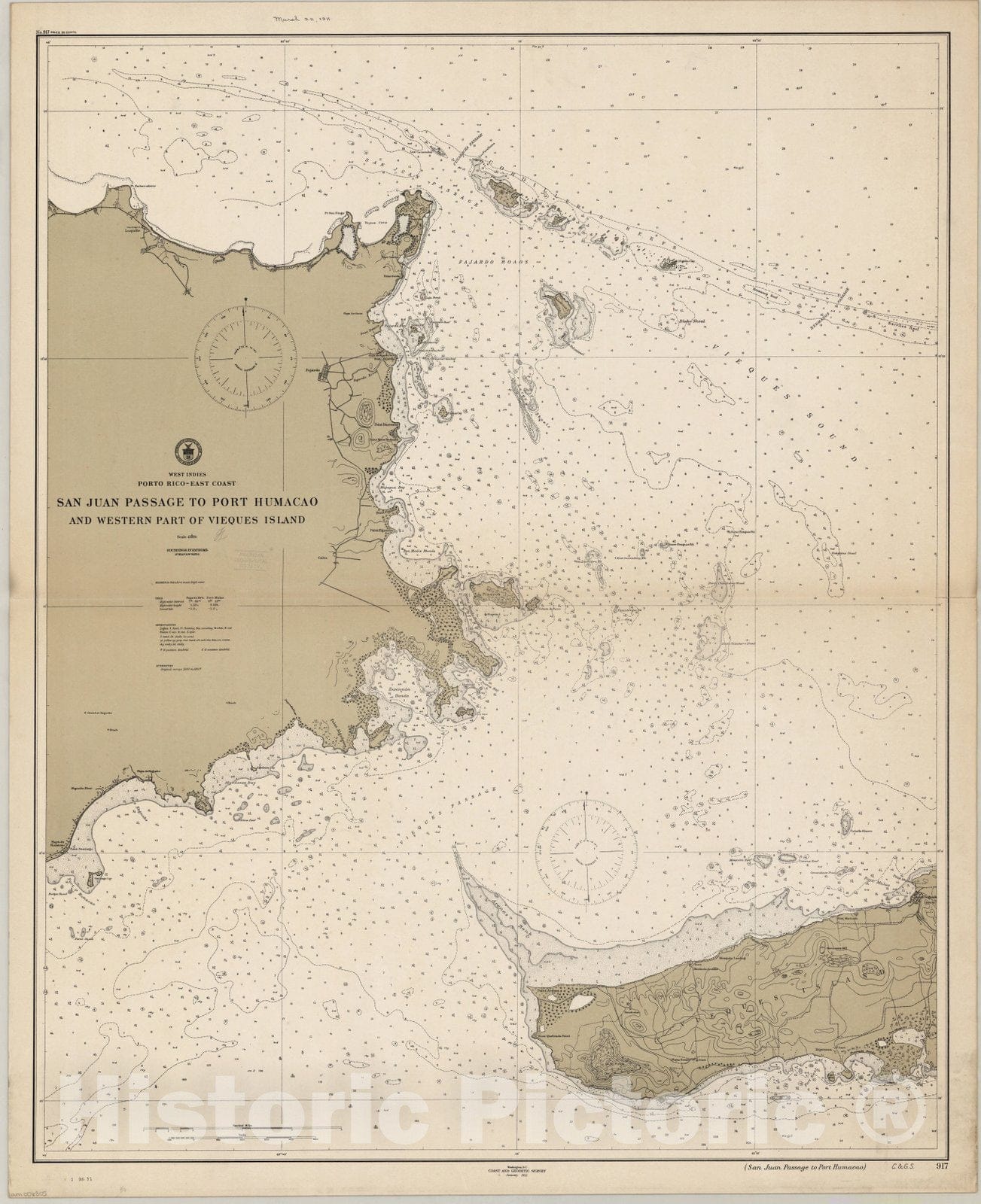 Historic Map : Port Humacao, Puerto Rico 1911, West Indies, Porto Rico - East Coast : San Juan Passage to Port Humacao and western part of Vieques Island , Antique Vintage Reproduction