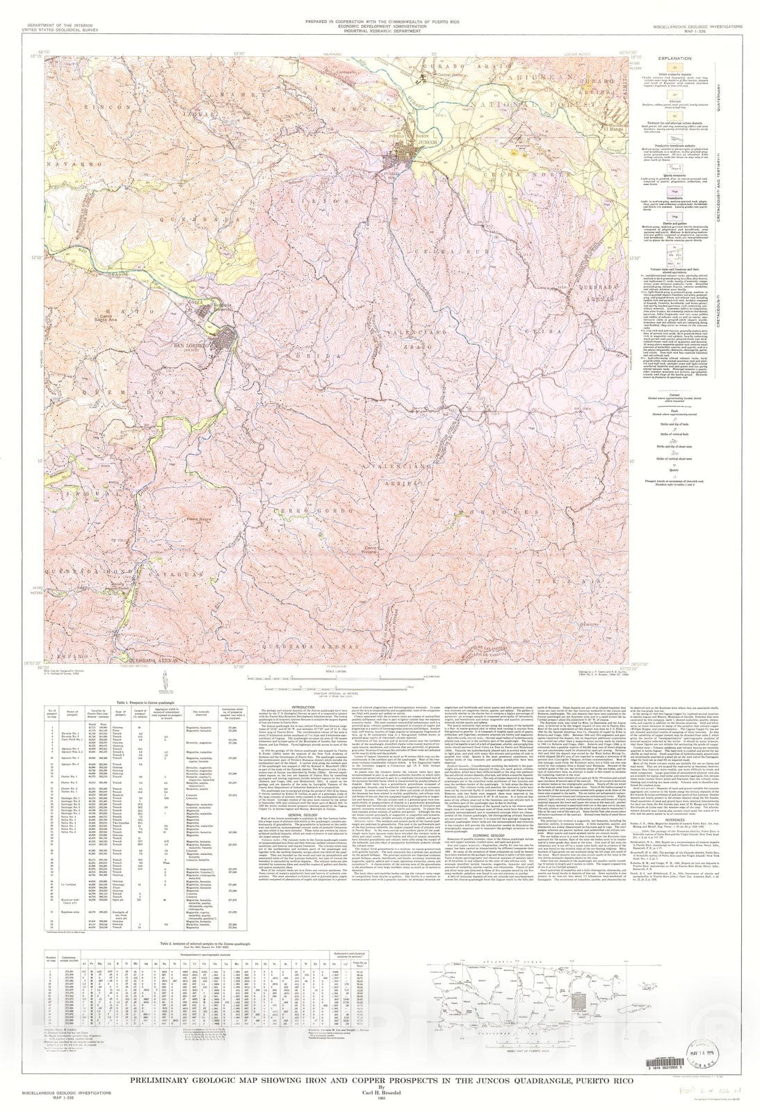 Map : Preliminary geologic map showing iron and copper prospects in the Juncos quadrangle, Puerto Rico, 1961 Cartography Wall Art :