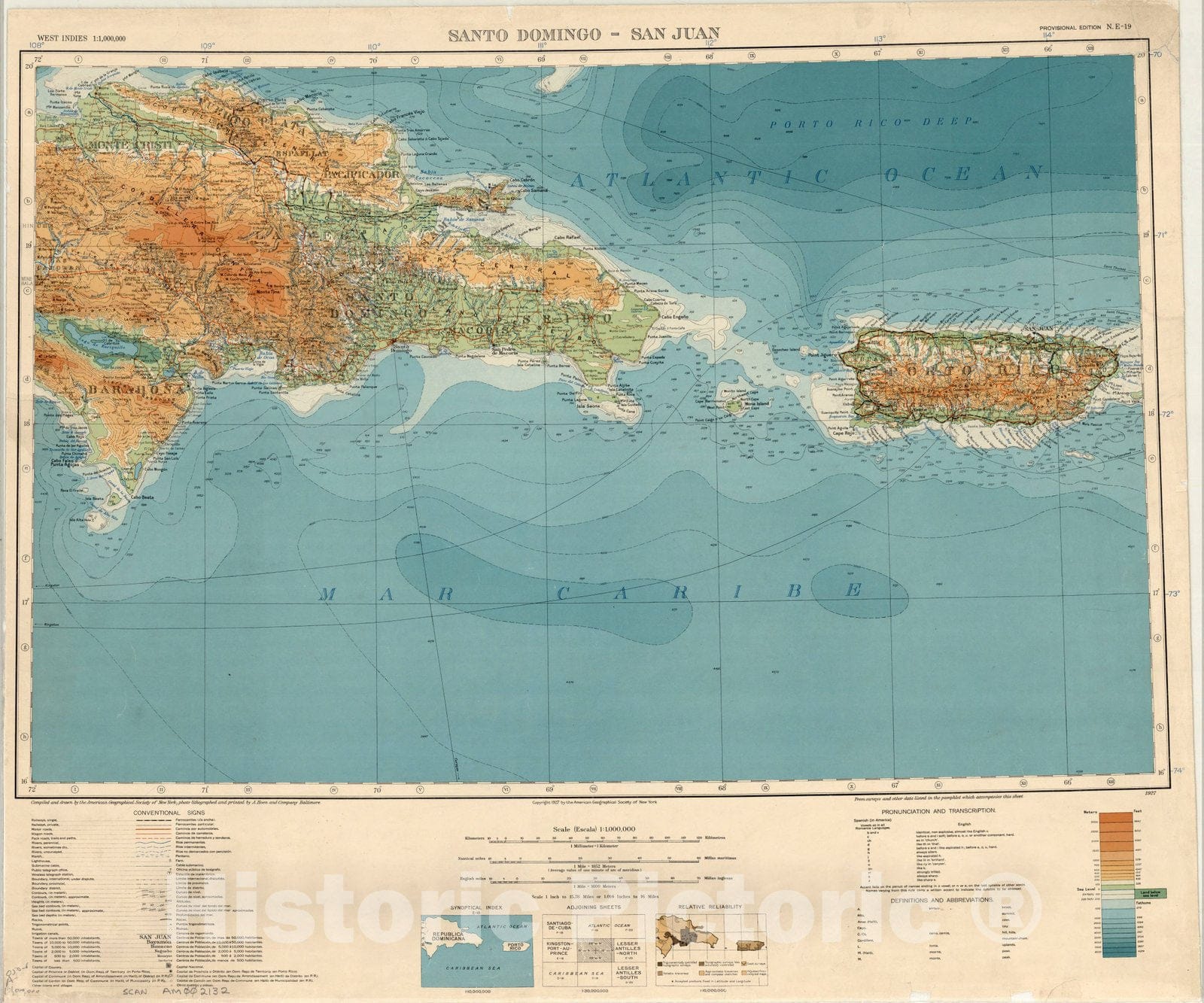 • .Map : Santo Domingo-San Juan, Dominican Republic and Puerto Rico 1927, Map of Hispanic America, Antique Vintage Reproduction