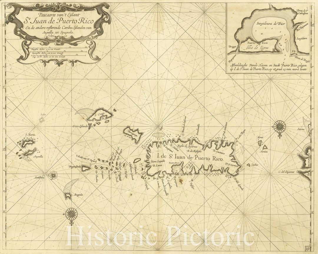 Historic Map : Pascaerte van't Eylant St. Juan de Puerto Rico en de andere resterend Caribes Eylanden van Anguilla tot Spagnola Robijn ex., 1678, v1, Vintage Wall Art