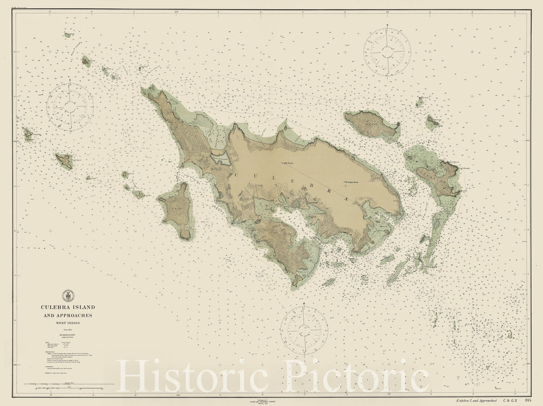 Map : Culebra Island, Puerto Rico 1914, Culebra Island and approaches, West Indies , Antique Vintage Reproduction