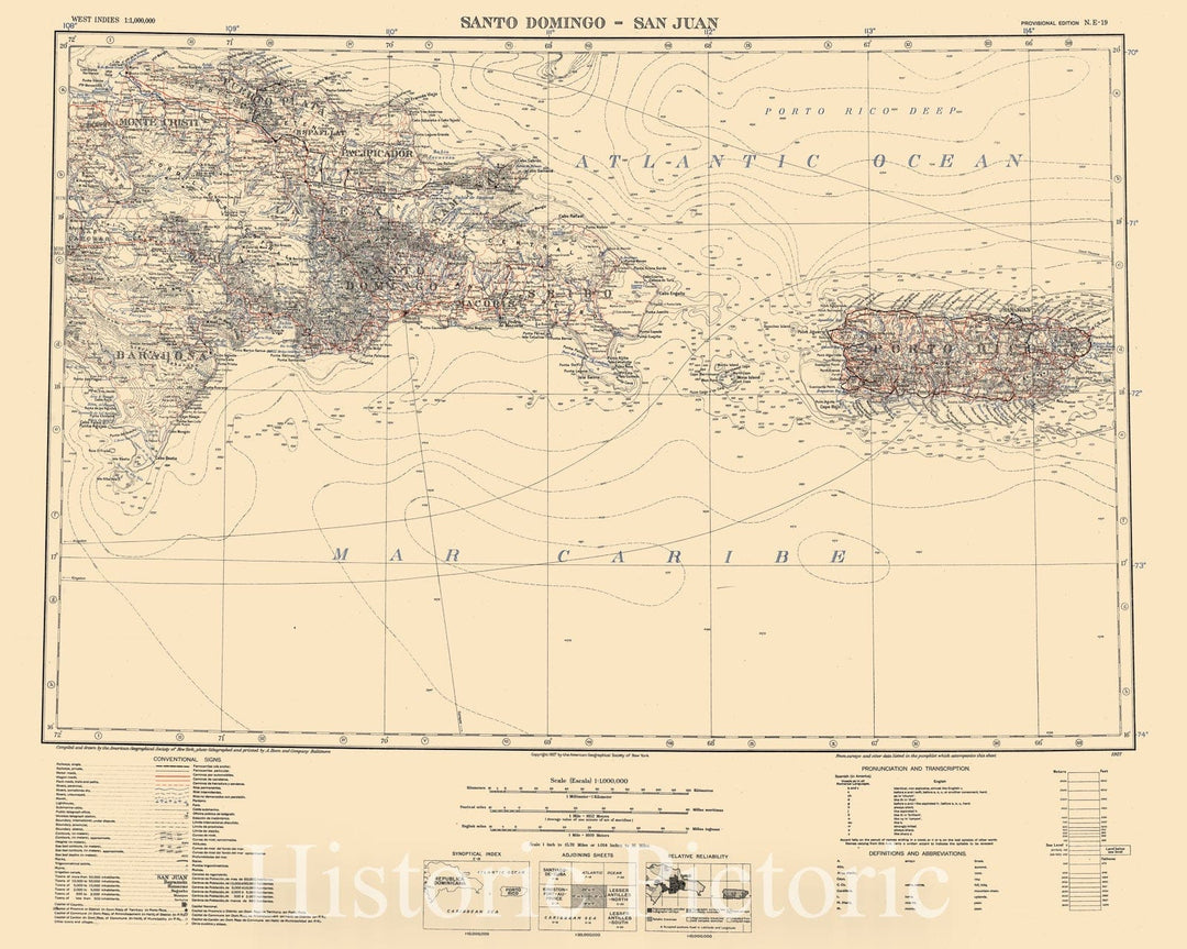 Map : Santo Domingo-San Juan, Dominican Republic and Puerto Rico 1927, Map of Hispanic America, Antique Vintage Reproduction