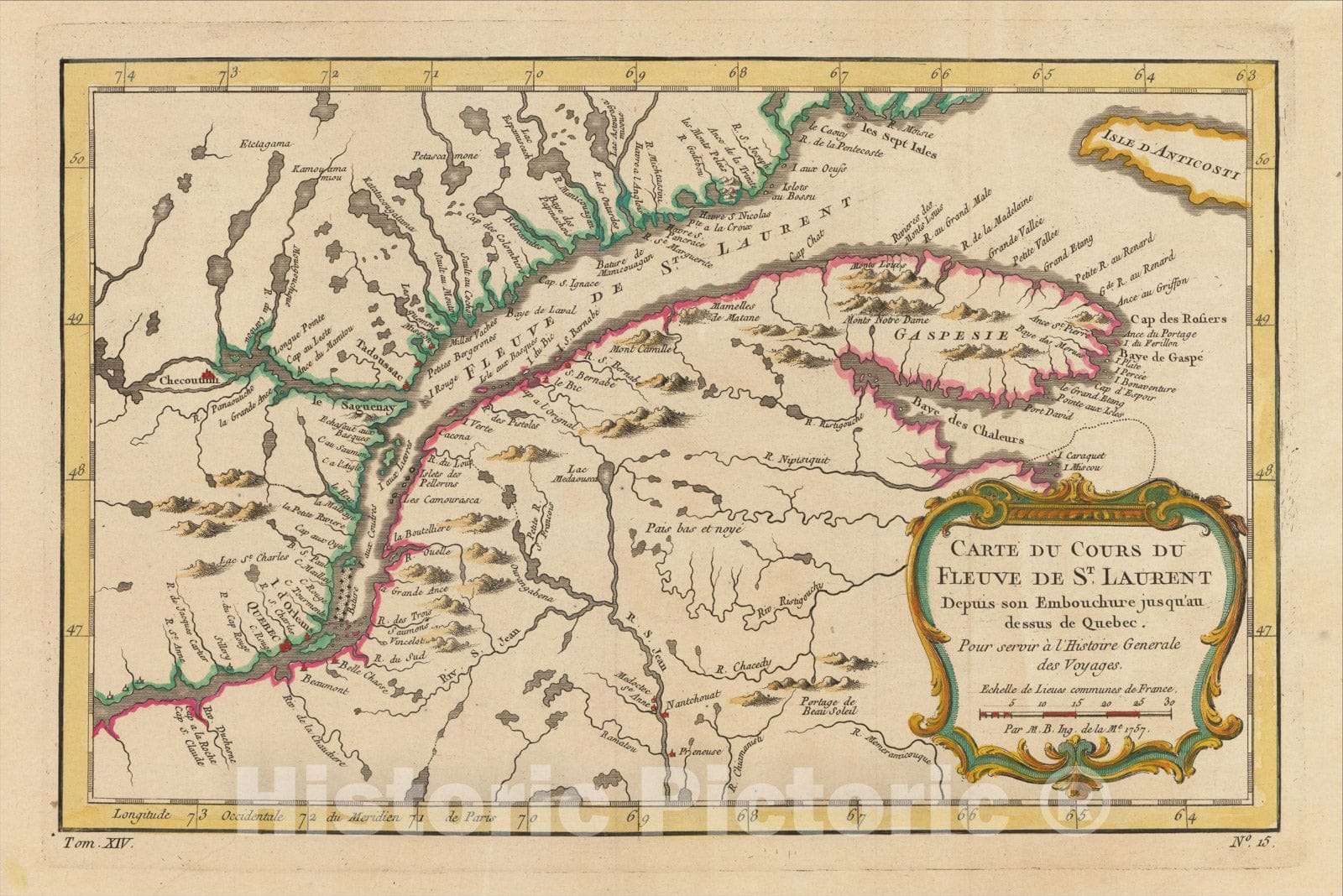 Historic Map : Carte Du Cours Du Fleuve De St. Laurent Depuis son Embouchere jusqu'au dessus de Quebec 1757, 1757, Jacques Nicolas Bellin, Vintage Wall Art