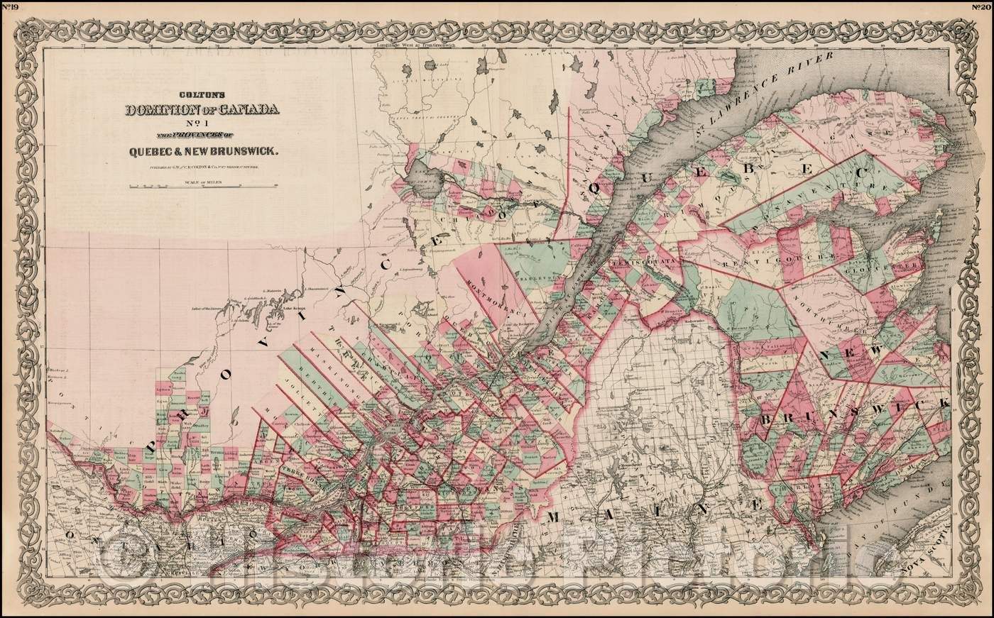 • .Historic Map - Colton's Dominion of Canada No. 1 the Provinces of Quebec & New Brunswick, 1865, G.W. & C.B. Colton - Vintage Wall Art