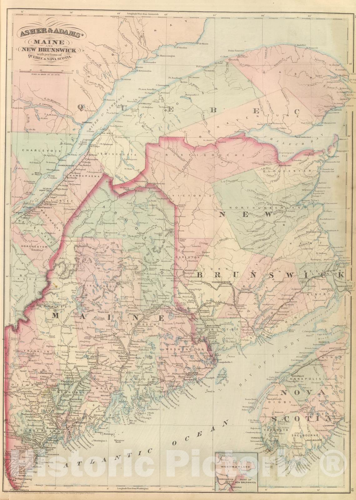Historic Map : Commercial Reference Book - 1875 Maine, New Brunswick, with portions of Quebec and Nova Scotia. - Vintage Wall Art
