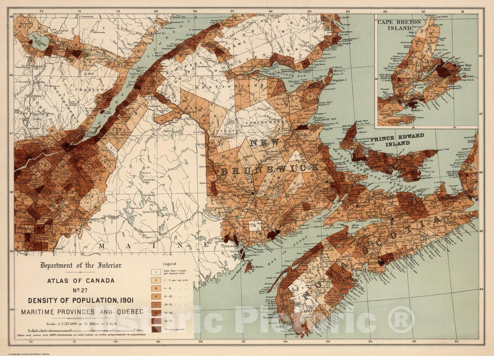 Department of Interior : Atlas of Canada, No. 27 : Density of population, 1901; Maritime Provinces and Quebec. (to accompany) Department of the Interior, Canada ... 1906. (inset) Cape Breton Island. | Department of the Interior, Canada. Honorable Frank Oliver, Minister, 1906. Atlas of Canada. Prepared under the direction of James White, F.R.G.S., Geographer. (on verso of title page) The Toronto Lithographing Company, Limited; Map engravers, and dedication note. | Full color, 21 p., 83 plates including maps and diagrams. The Atlas of Canada, first edition published by the Department of the Interior in 1906, was one of the world's first national atlases. A second edition similar in style and content was published in 1915, both editions, featuring thematic maps dealing with Canada's geology, communications, natural resources, population, economic activities, transportation, as well as maps of principal cities. During this period, a major part of Canada's growth was due to the great influx of immigrants into Canada, many of them coming to open up the farmlands of the Prairies. Consequently, the first two editions of the Atlas of Canada reflect a particular interest in transportation and communications and devote a significant amount of space to mapping the composition and density of the population. Bound in half leather brown covered boards with "Department of Interior 1906 Atlas of Canada." in gilt. Atlas is bound in half leather brown cloth covered boards with "Department Of The Interior. 1906. Atlas of Canada."