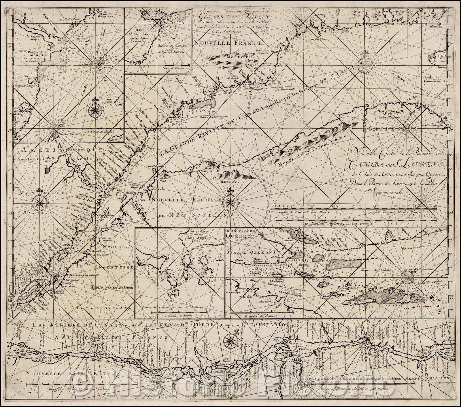 • .Historic Map - Nouvelle Carte de la Riviere de Canada ou St. Laurens de l'Ile de Anticoste jusqua Quebec. Dans la Partie d'Amerique la Plus Septentrionale, 1725 - Vintage Wall Art