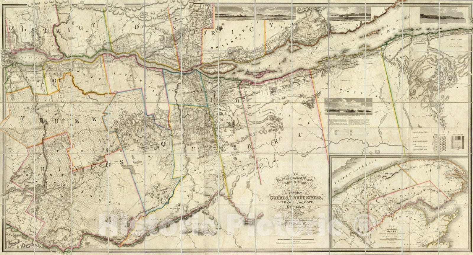 Historic Map : This topographical map of the Districts of Quebec, Three Rivers, St. Francis and Gaspe, Lower Canada, 1831 - Vintage Wall Art