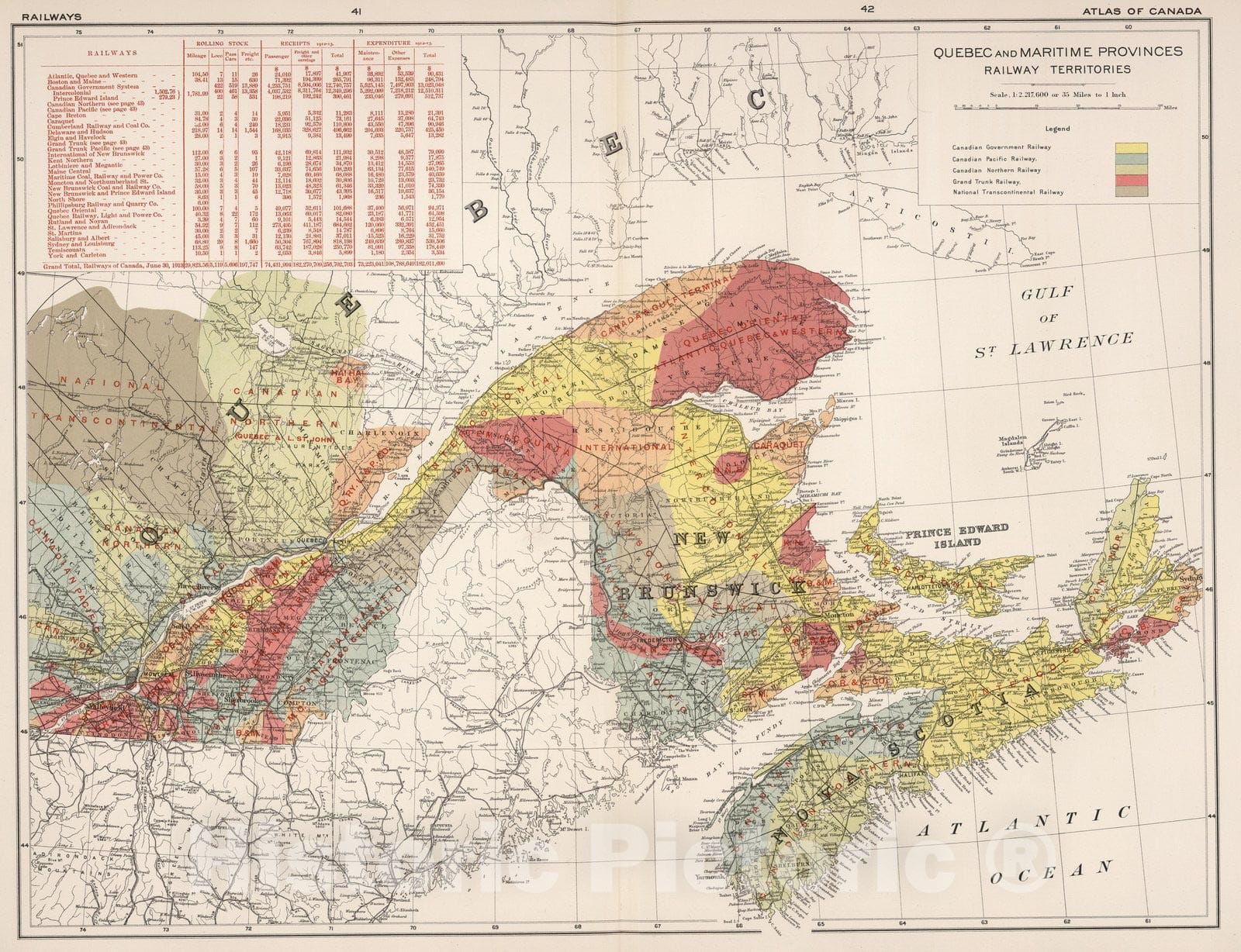 Quebec and Maritime Provinces railway territories. (on upper right margin) Atlas of Canada. (to accompany) Department of the Interior Canada. Atlas Of Canada, 1915. | Department of the Interior Canada. Honourable W.J.Roche, Minister 1915. Atlas Of Canada. Revised and enlarged edition. Prepared under the direction of J.E. Chalifour, Chief Geographer. | First edition was in 1906 (see our 1645.000). Printed full color maps. Bound in dark green cloth covered boards with "Department Of The Interior. Atlas Of Canada. 1915" stamped in gilt. Spine reads "Atlas Of Canada. 1915."