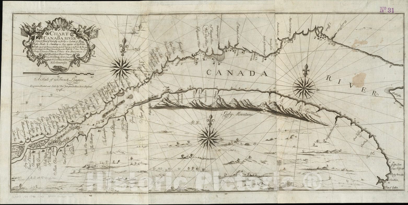 Historical Map, 1746 A Chart of Canada River : from ye Island of Anticosty as far up as Quebeck, ye Islands, Locks, Shoals, soundings as They Appear at Low Water, Vintage Wall Art