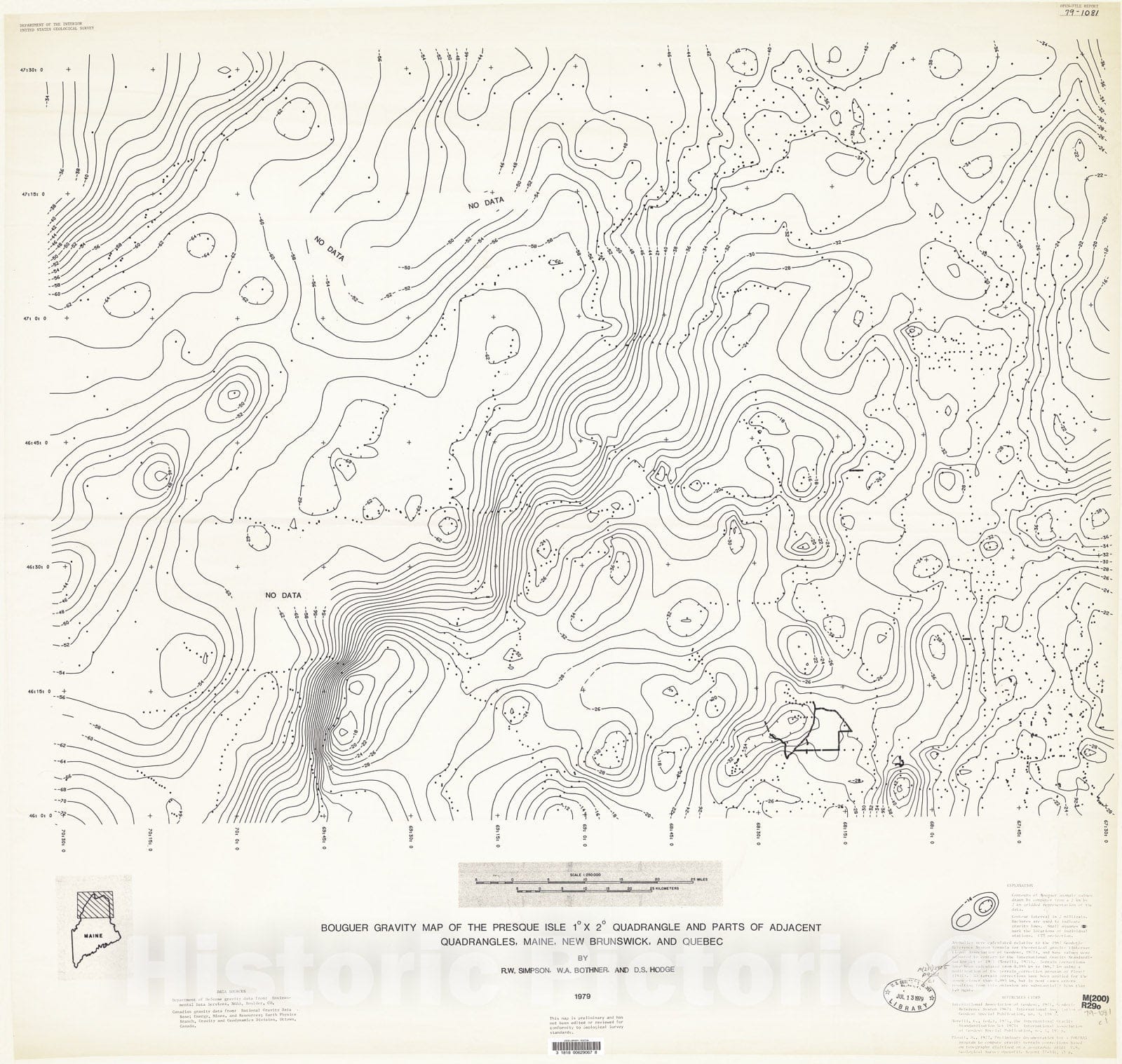 Map : Bouguer gravity map of the Presque Isle one degree x two degree quadrangle and parts of adjacent quadrangles, Maine, New Brunswick, and Quebec, one979 Cartography Wall Art :