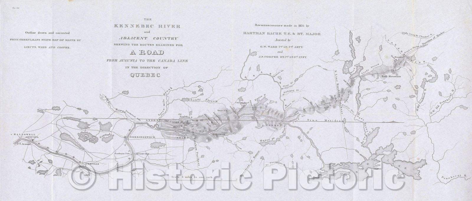 • .Historic Map : The Kennebec River and Adjacent Country Shewing the routes Examined for a Road from Augusta, Maine to the Canada Line in the Direction of Quebec, 1834 , Vintage Wall Art