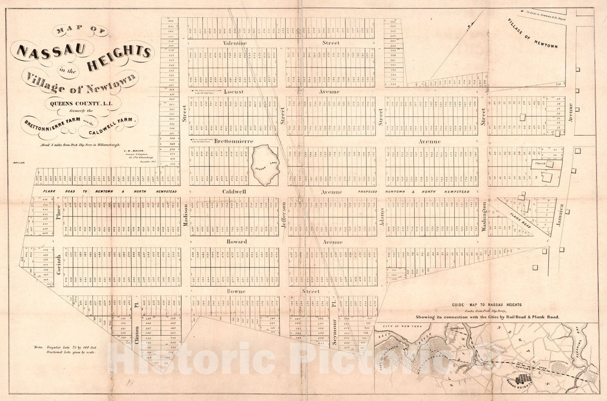 • .Historic 1853 Map - Map of Nassau Heights in The Village of Newtown, Queens County, L.I. : Formerly The Brettonnierre Farm, Now The Caldwall Farm : About 4 Miles from Peck Slip Ferry