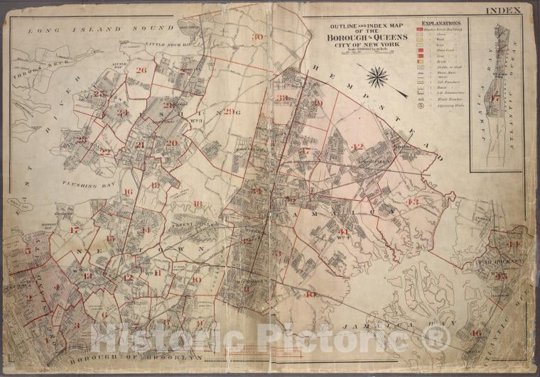 Historic 1909 Map - Outline And Index Map Of The Borough Of Queens, City Of New York