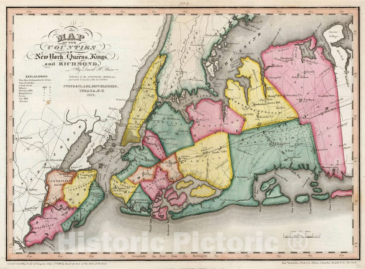 • .Historic Map : Map of The Counties of New York, Queens, Kings, and Richmond, 1839 Atlas - Vintage Wall Art