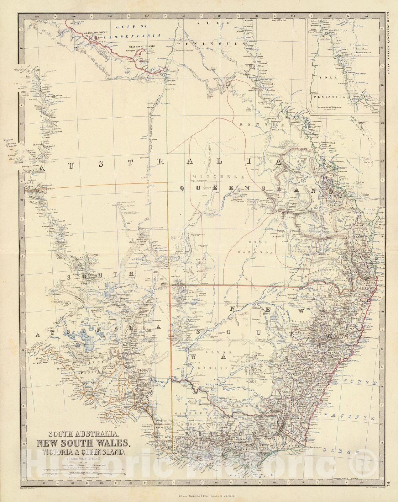 South Australia, New South Wales, Victoria & Queensland. By Keith Johnston, F.R.S.E. Engraved & printed by W. & A.K. Johnston, Edinburgh. William Blackwood & Sons, Edinburgh & London, (1861) | The royal atlas of modern geography, exhibiting, in a series of entirely original and authentic maps, the present condition of geographical discovery and research in the several countries, empires, and states of the world by Alexander Keith Johnston ... With a special index to each map. William Blackwood and Sons, Edinburgh and London. MDCCCLXI. | First edition. This atlas was one of the best world atlases published in England in the second half of the 19th century. The North America map shows Colorado as a Territory - very up to date on U.S. political changes (most U.S. atlases do not show Colorado until 1862) for an English Atlas. Also shows Nevada, and a horizontal Arizona. However, the western U.S. map shows none of this -- its layout is pre-1860. Maps have a mixture of hand colored outline and printed blue color for water. Covers are half leather brown cloth covered boards with "Keith Johnston's royal atlas of modern geography" stamped in gilt on the cover, and "The Royal Atlas. Keith Johnston. W. Blackwood & Sons" on the spine.