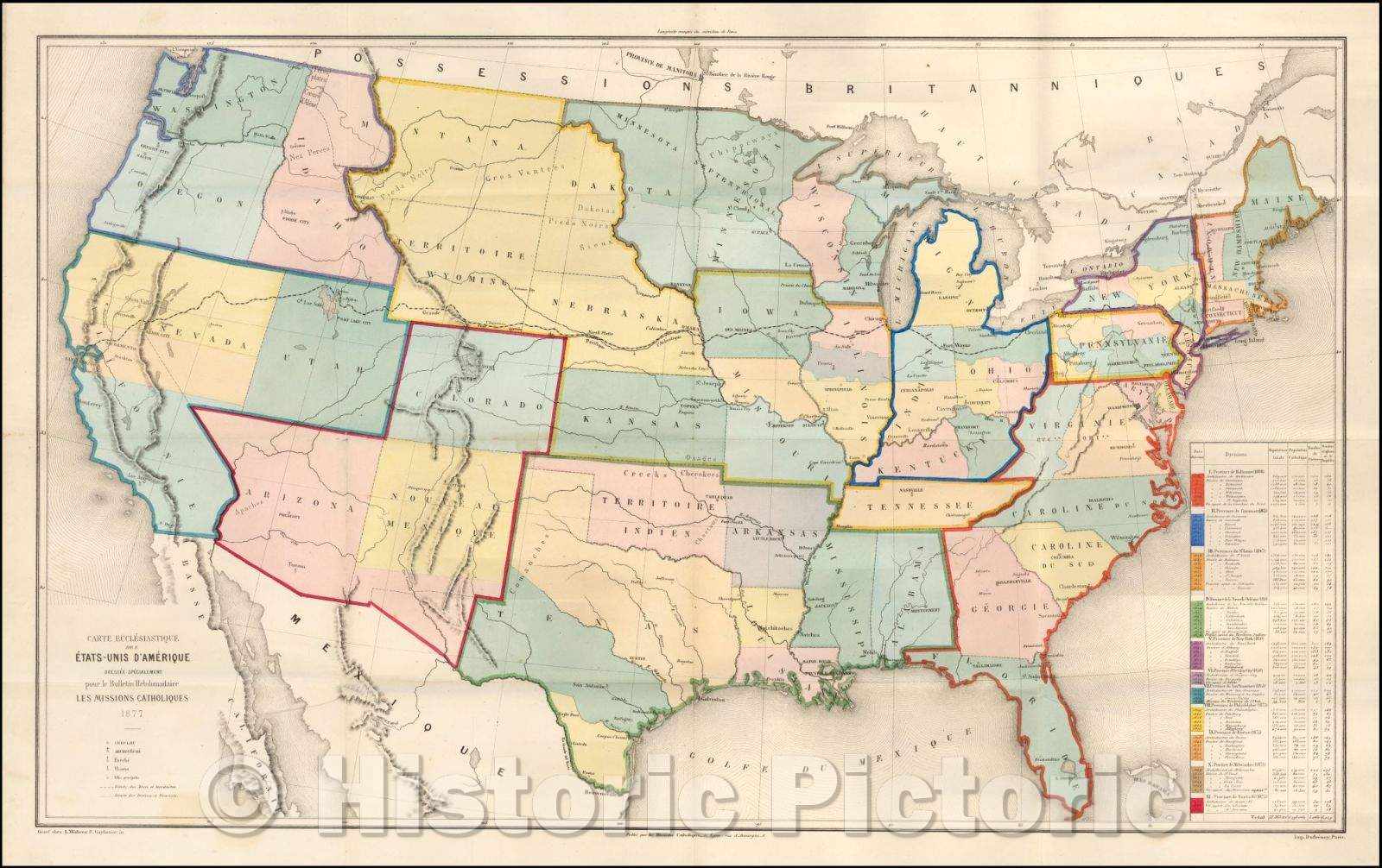 Historic Map - Carte Ecclesiastique Des Etats-Unis D'Amerique Dressee Specialement pour le Bulletin Hebdomadaire Les Missions Catholiques, 1877, Dufrenoy - Vintage Wall Art