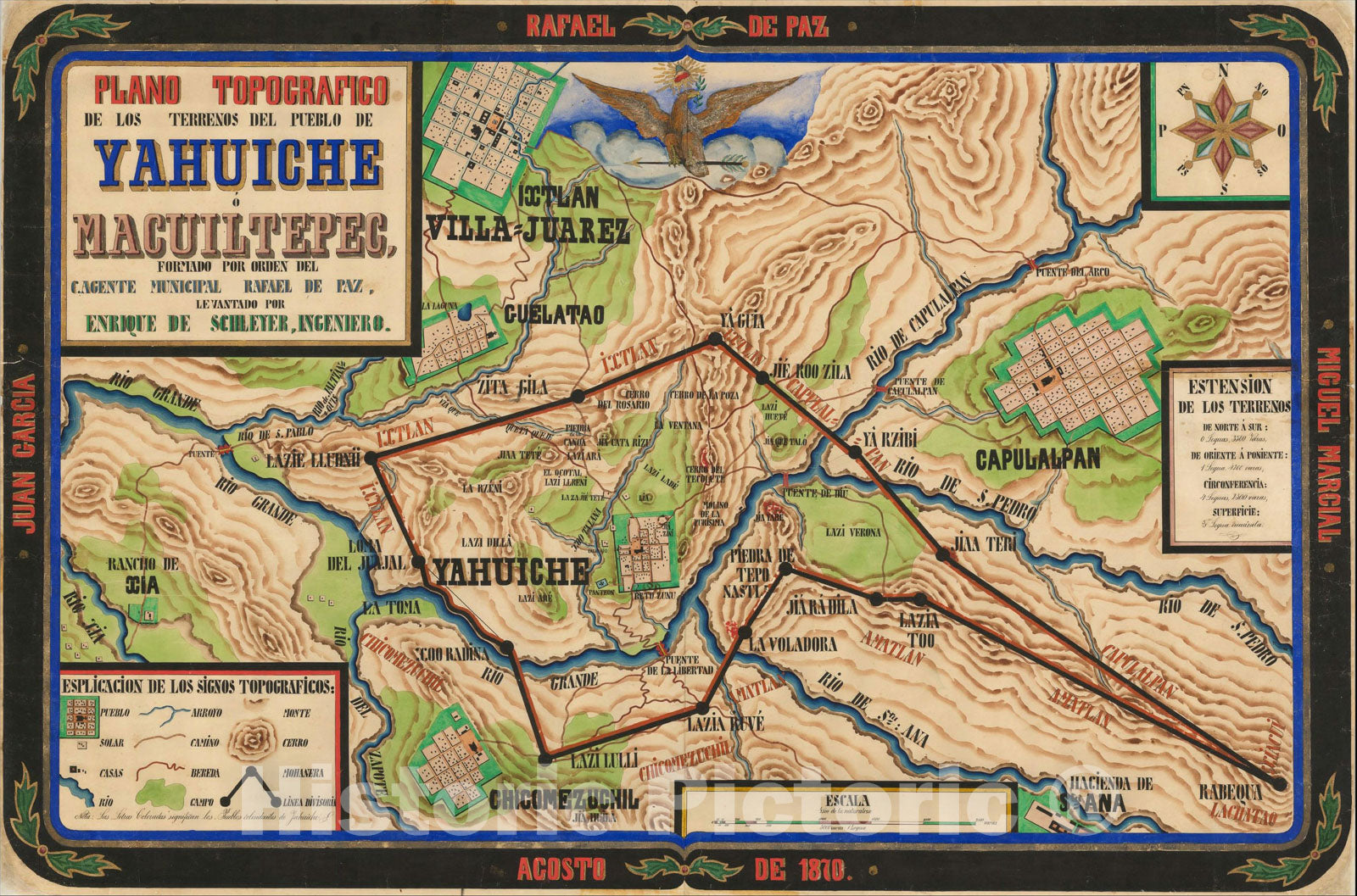 Historic Map : Plano Topografico de los Terrenos del pueblo de Yahuiche o Macuiltepec, 1870, Enrique de Schleyer, Vintage Wall Art