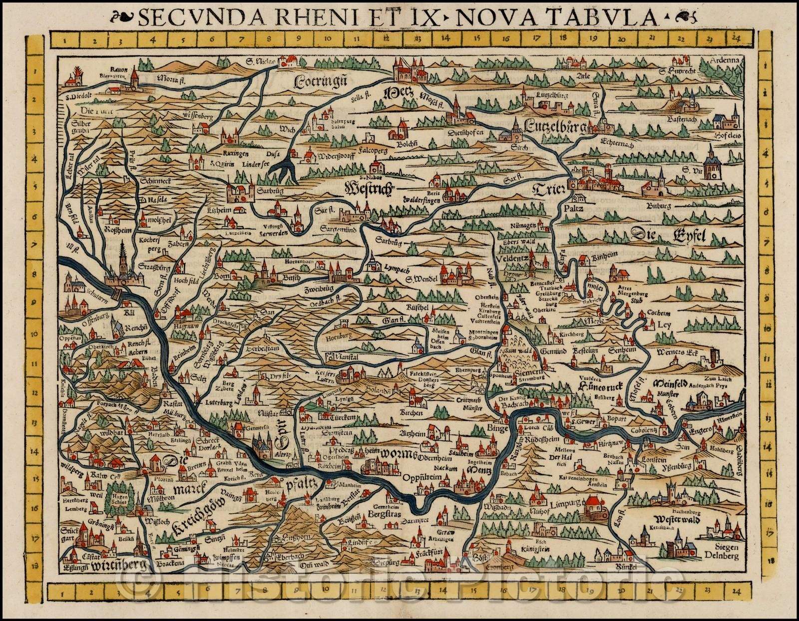 • .Historic Map - Secunda Rheni Et IX Nova Tabula/The second Reno Nova 9, 1552, Sebastian M?nster - Vintage Wall Art