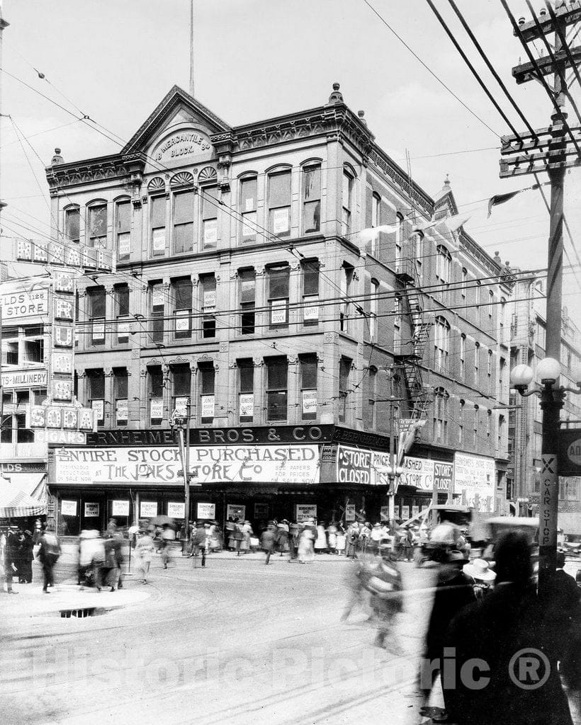 The Mercantile block building, constructed in 1884, once stood on Main Street as the home of G. Bernheimer Brothers and Company store. The building was demolished in 1919 make way for a new building for the S.S. Kresge Company store, then one of the bi