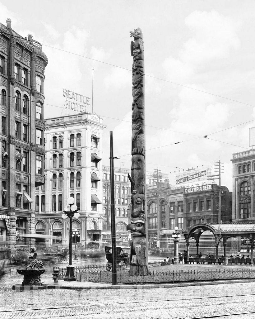 • .Historic Black & White Photo - Seattle, Washington - Totem Pole in Pioneer Square, c1905 -