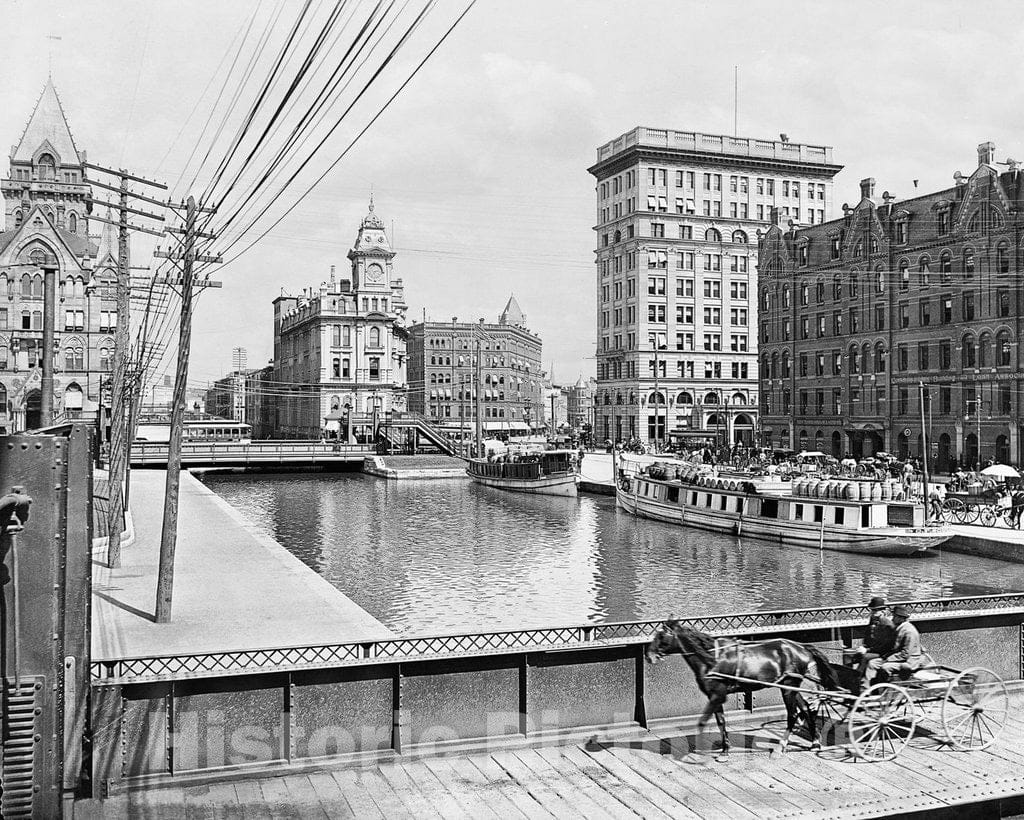 Restored Black & White Photo - Historic Syracuse, New York - The Canal on Salina Street, c1900