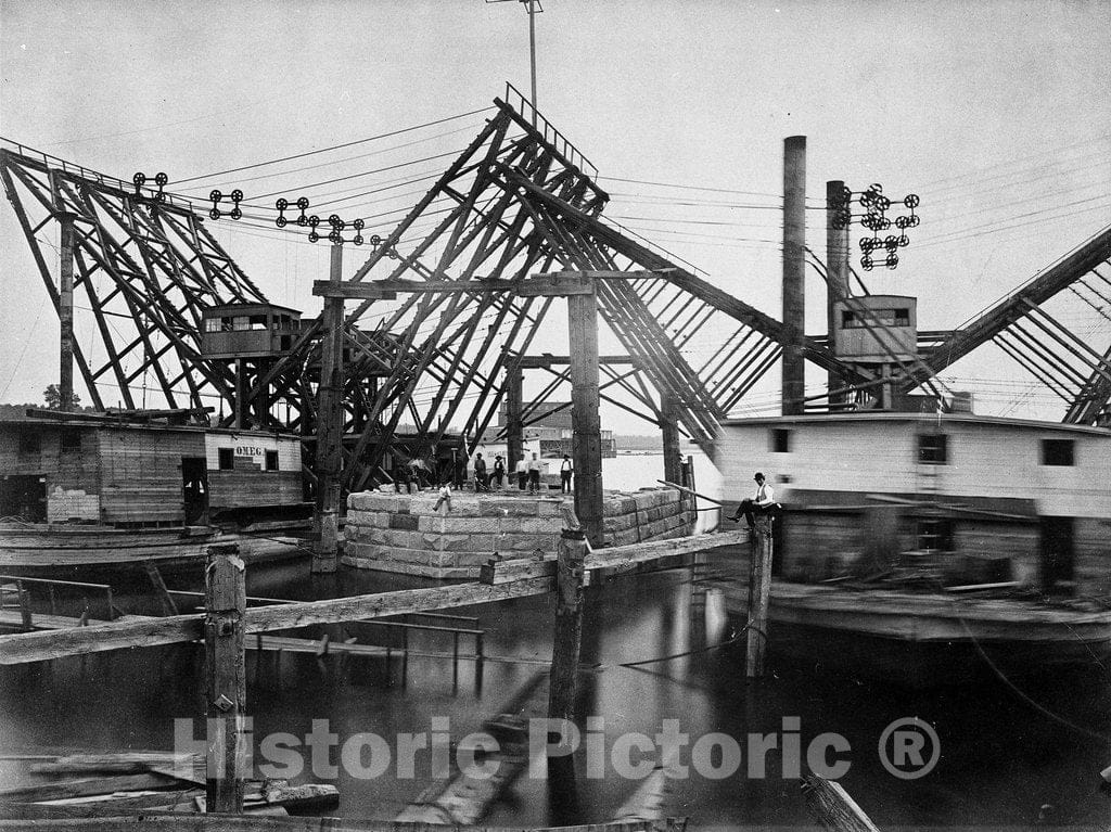 • .St. Louis Historic Black & White Photo, Sinking the east pier, Eads Bridge, c1870 -