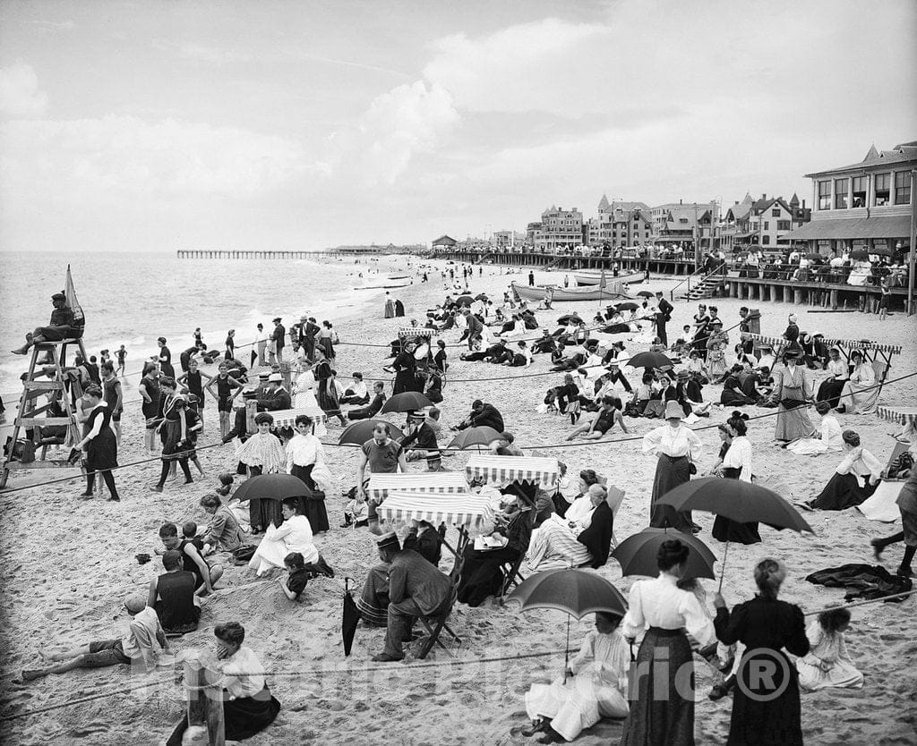 New Jersey Historic Black & White Photo, The Crowded Beach at Ross' Pavilion, Ocean Grove, c1905 -