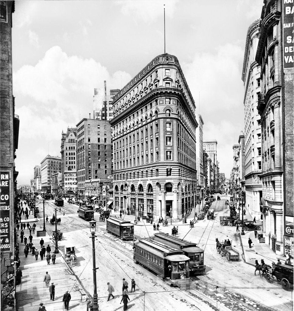 San Francisco Historic Black & White Photo, Streetcars on Market Street at the Crocker Building, c1912 -