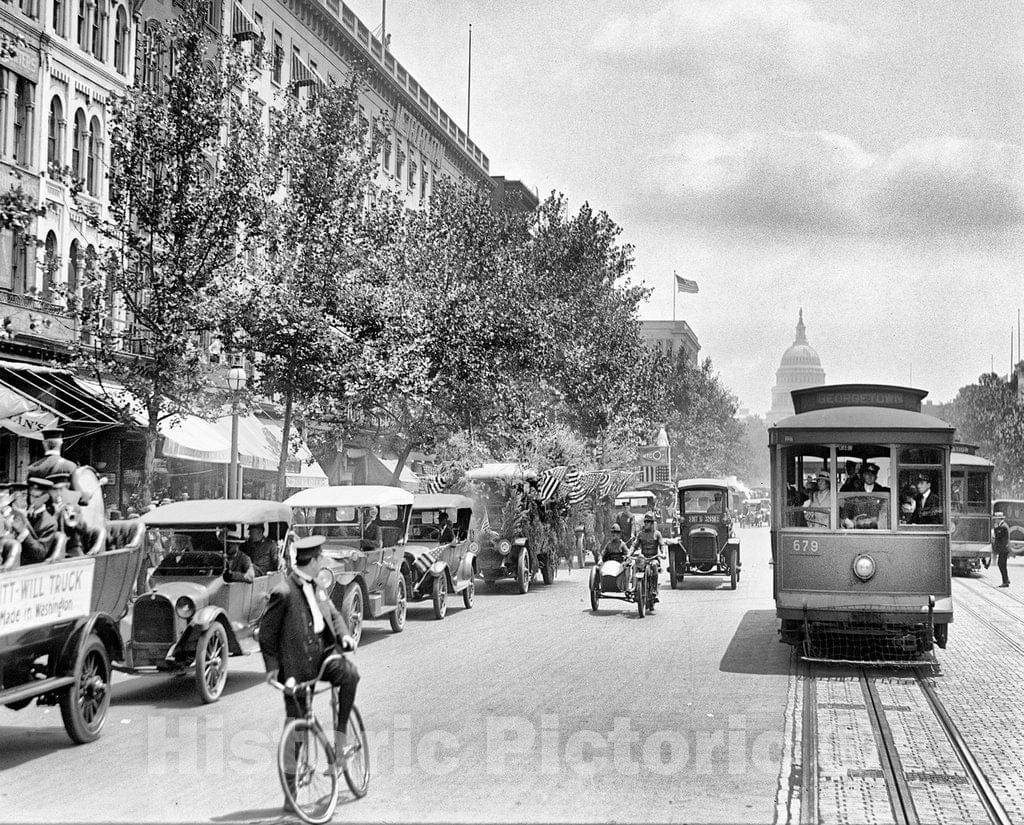 Washington D.C. Historic Black & White Photo, Truck Parade Down Pennsylvania Avenue, c1919