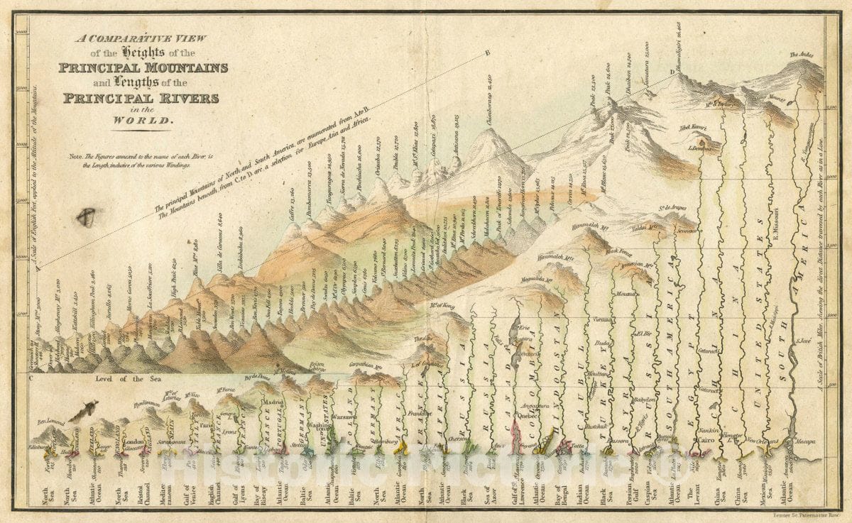 • .Historic Map : 1830 Comparative View of The Heights of The Principal Mountains and Lengths of The Principal Rivers. - Vintage Wall Art