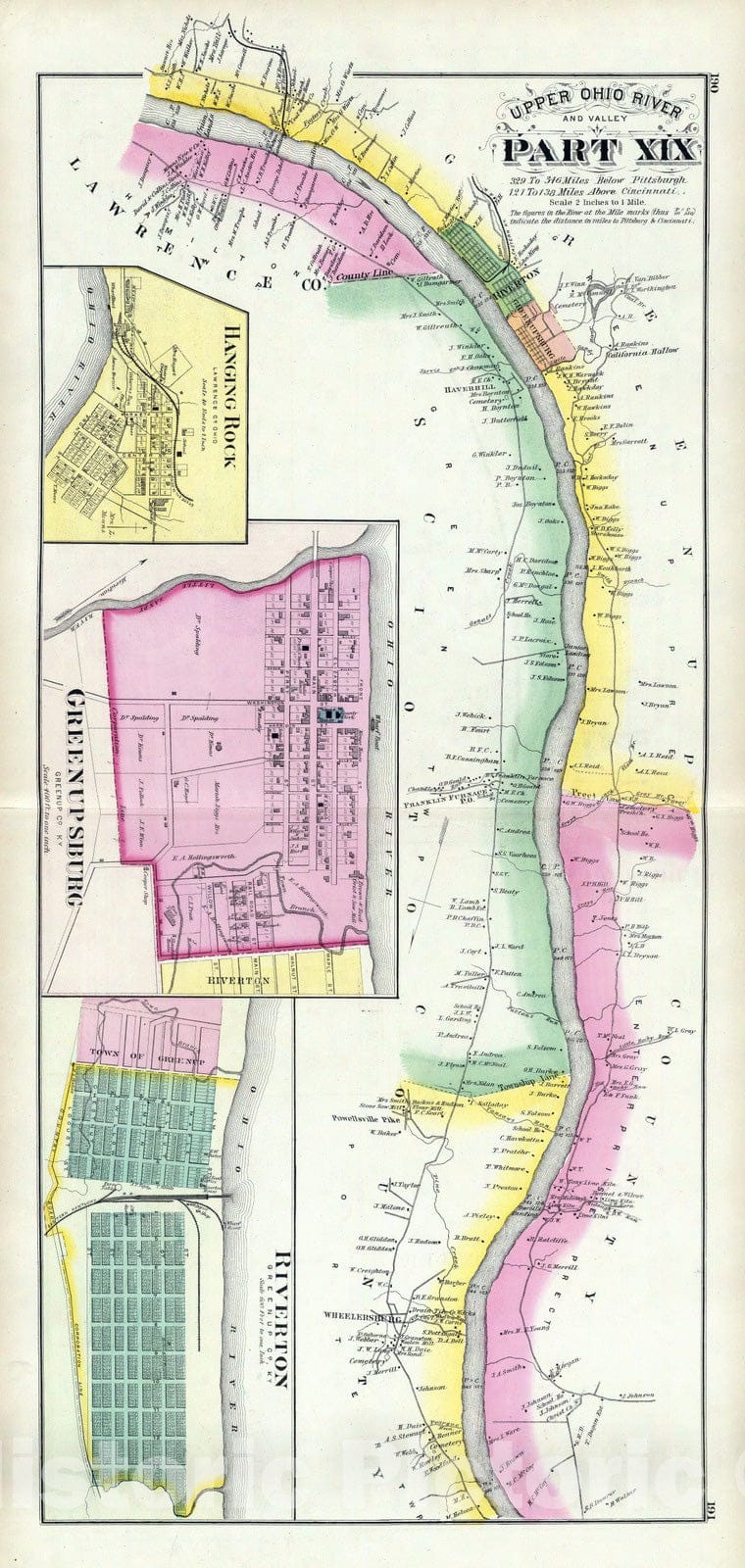 • Historic Map : 1877 Upper Ohio River and Valley part XIX, 329 to 346 miles below Pittsburgh, (with) Hanging Rock, Ohio; Greenupsburg, Riverton, Ky.