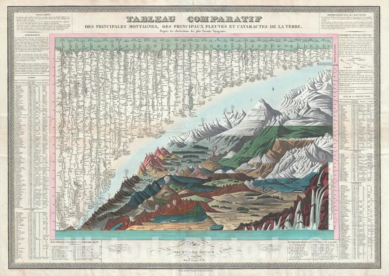 • Historic Map : Comparative Chart of The World's Mountains and Rivers, Bulla, 1826, Vintage Wall Art