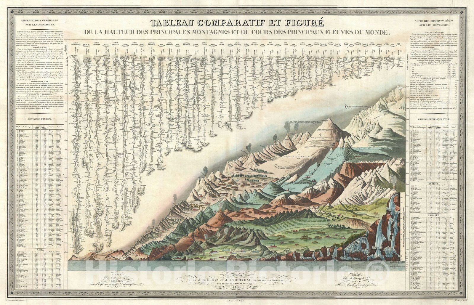 Historic Map : Comparative Mountains and Rivers Chart, Goujon, 1836, Vintage Wall Art