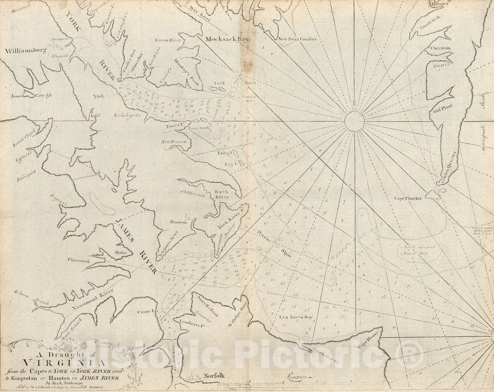 Historic Map - A Draught of Virginia from the Capes to York in York River and to Kuiquotan or Hamton in James River, 1767, George Grierson - Vintage Wall Art