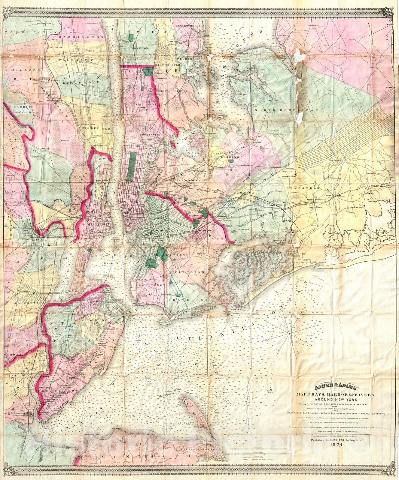 Historic Map : Dripps Map of The Bays, Harbors and Rivers Around New York City, New York , 1874, Vintage Wall Art