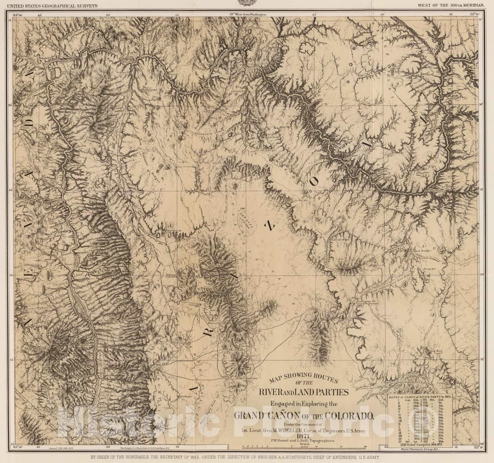 Historic Map : Exploration Book - 1889 Map, River and Land Parties, Exploring Grand Canon of The Colorado. - Vintage Wall Art