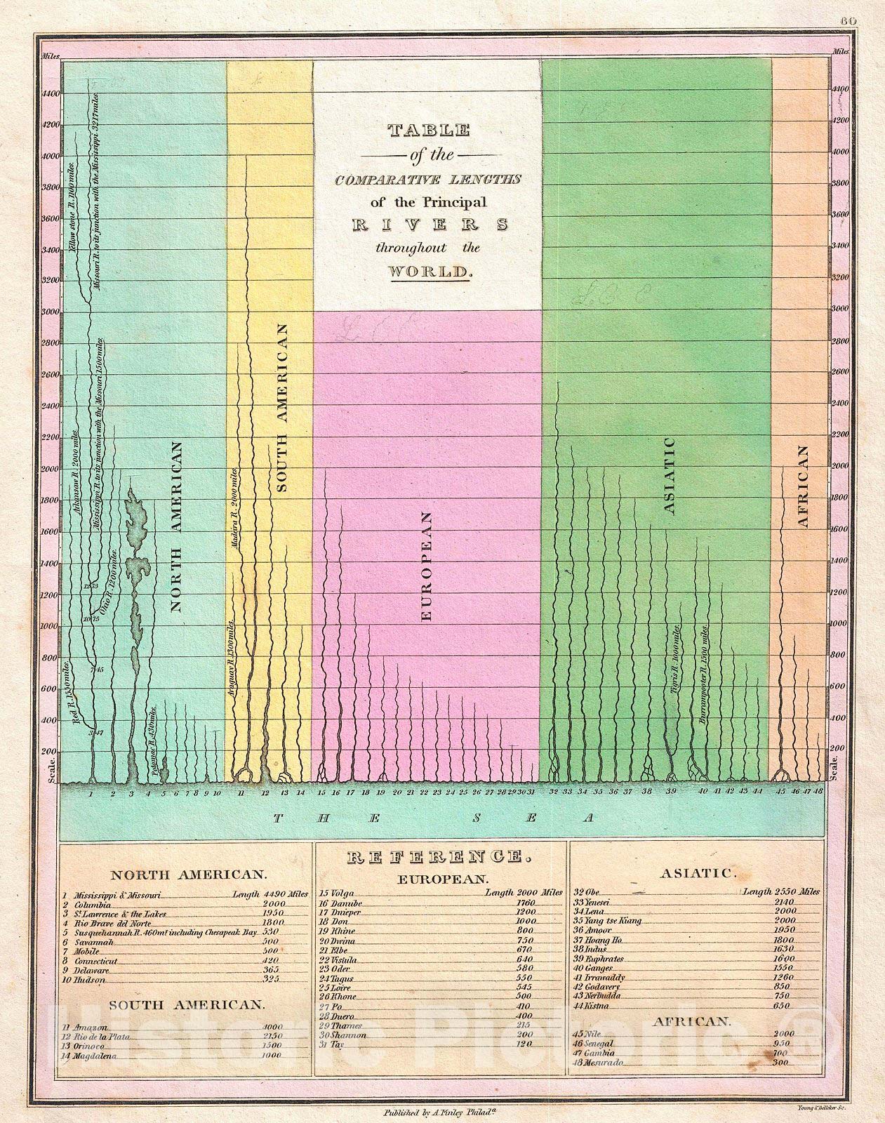 This is Finley's highly sought after c. 1827 map of the comparative lengths of the principal rivers of the world. Details the world's great rivers in relative to one another and divided by continent. Each river is numbered and refers to a reference list below the chart proper, which names each river and its length. There are a couple of curiosities. The Mississippi is considered, by far, to be the world's longest river. The length of the Nile is grossly underestimated - when this was made the source of the Nile had yet to be determined. The St. Lawrence River is drawn to include four of the five Great Lakes. Engraved by Young and Delleker for the 1827 edition of Anthony Finley's General Atlas .