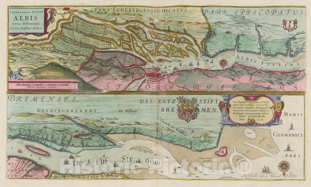 • .Historic Map : Germany , Hamburg Germany, Elbe River 1665 Celeberrimi Flvvii Alvis nova delineatio , Vintage Wall Art