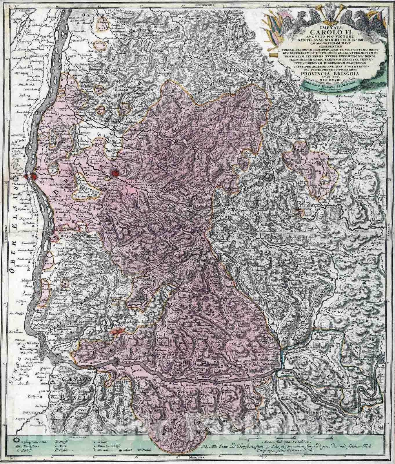 Historic Map : Germany, Rhine River 1718 Imp.Caes. Carolo VI, Provincia Brisgola. , Vintage Wall Art
