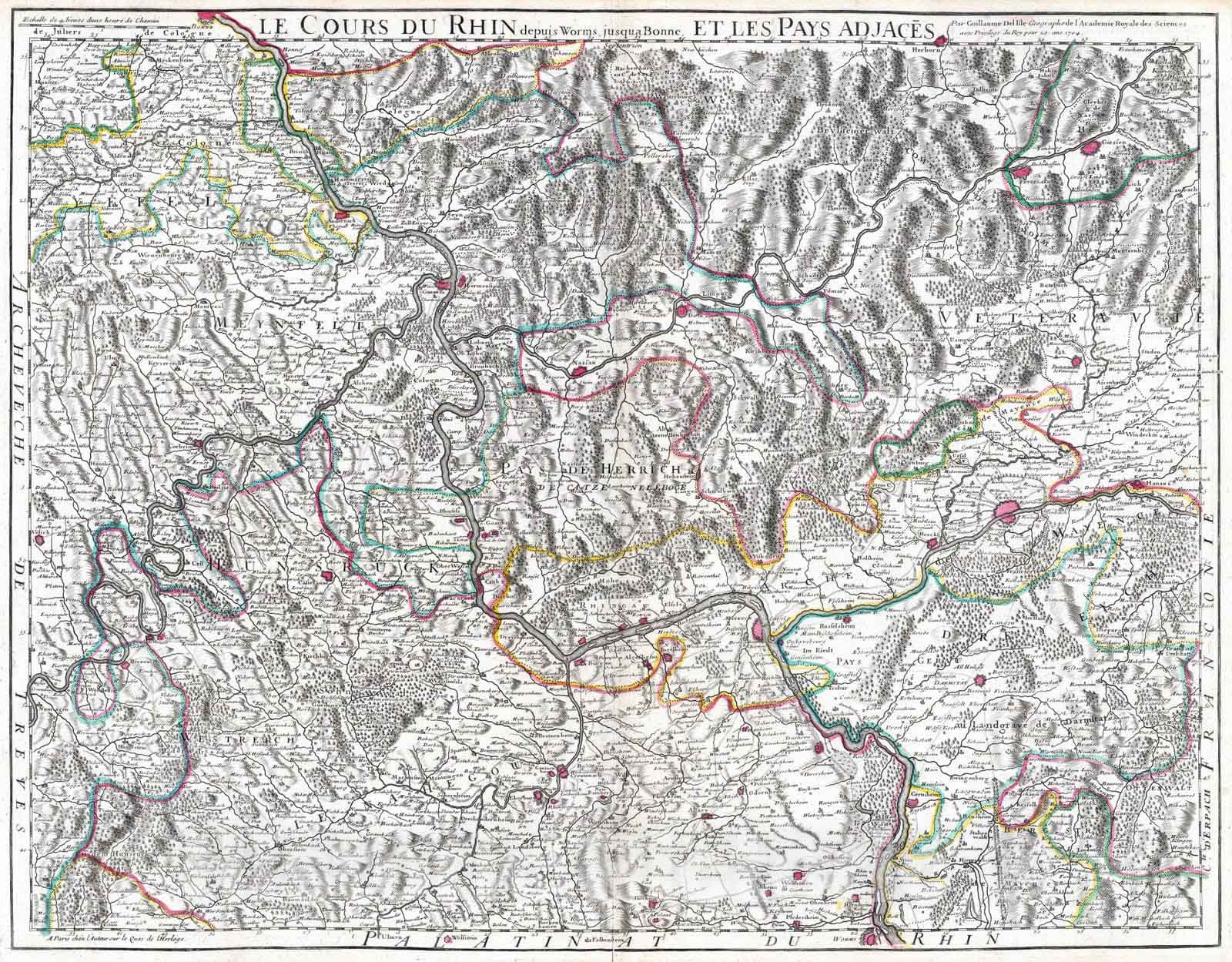 Historic Map : Germany, Rhine River Valley 1704 Le Cours du Rhin depuis Worms, jusqu'a Bonne, et le pays adjacens. , Vintage Wall Art