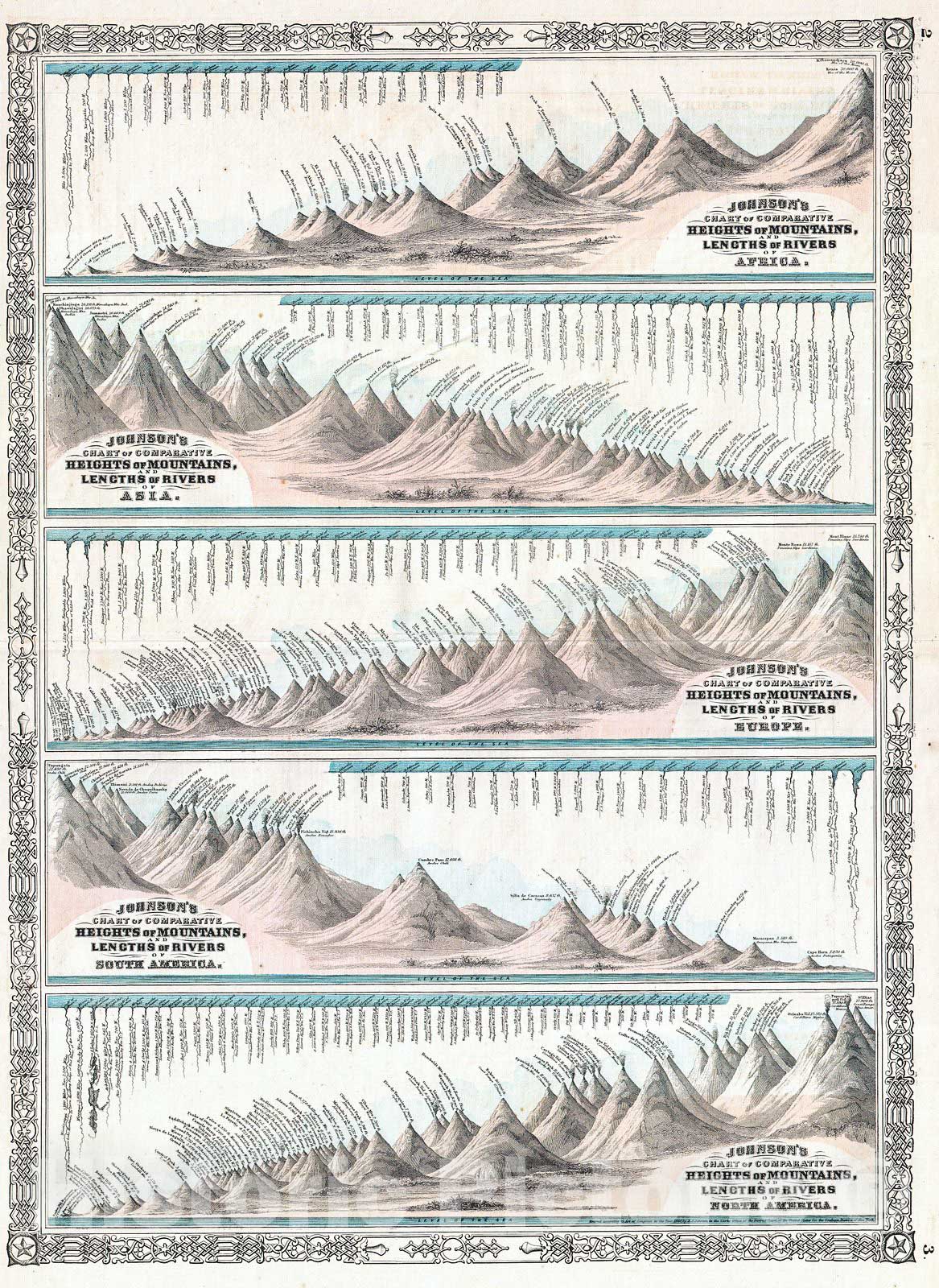 This is the 1864 edition of Johnson's Mountains and Rivers Chart. This chart, printed in 1864, represents a significant reimagining and re-engraving of Johnson's pre-1864 mountains and rivers charts. Johnson first introduced a mountains and rivers chart in the second edition of his atlas, published in 1861. That chart, based on a related 1855 chart engraved by J. H. Colton, was very similar to other topical charts common in European atlases of the period in that it presented all of the great mountains and rivers of the world in a single panoramic view. Johnson, perhaps recognizing that the traditional chart, which necessarily highlighted the primacy of the great mountains and rivers of Asia, was difficult to read with regard to the regions that interested his constituent readers - North Americans and Europeans. Thus Johnson re-engraved his chart, taking the bold step of dividing the world's great mountains and rivers by continent. North America, still not fully explored when this map was published lists Mt. St. Elias, of the Canadian Yukon, as the highest mountain, followed by the Popocatepetl and Orizaba volcanoes of Mexico. This is in fact somewhat reversed from actuality, with Orizaba being the highest at 18,504 feet, followed by Elias at 18,009 feet, and Popocatepetl at 17,930. At this time, neither Mount McKinley (Denali) nor Mount Logan, the true highest peaks of North America, had been measured. Even so, Johnson does correctly recognized the Mississippi as the continent's longest river. Published by A. J. Johnson as plate nos. 2-3 for issue in the 1864 edition of Johnson's Family Atlas . Dated an copyrighted, 1864.