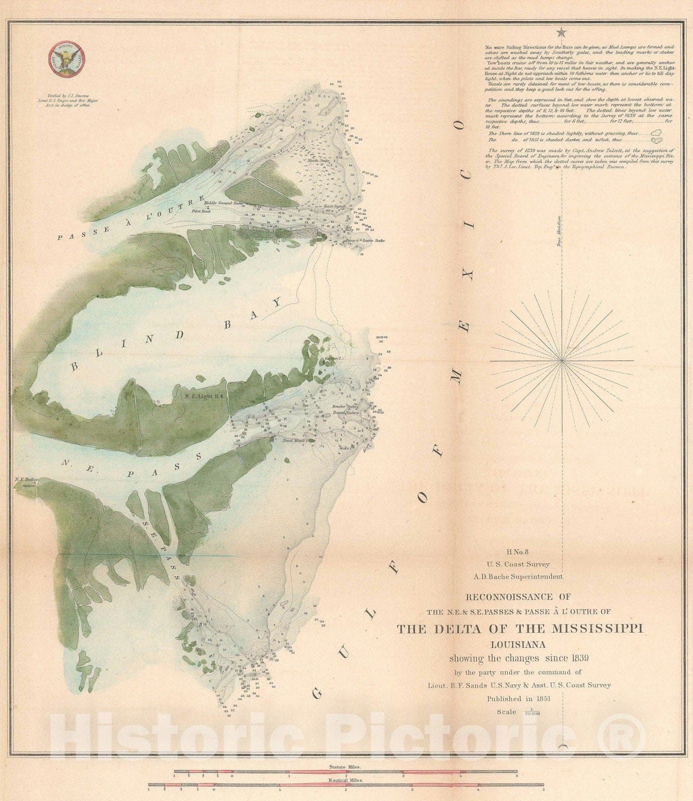 • .Historic Map : Nautical Chart The Mississippi River Delta, Louisiana, U.S. Coast Survey, 1851, Vintage Wall Art