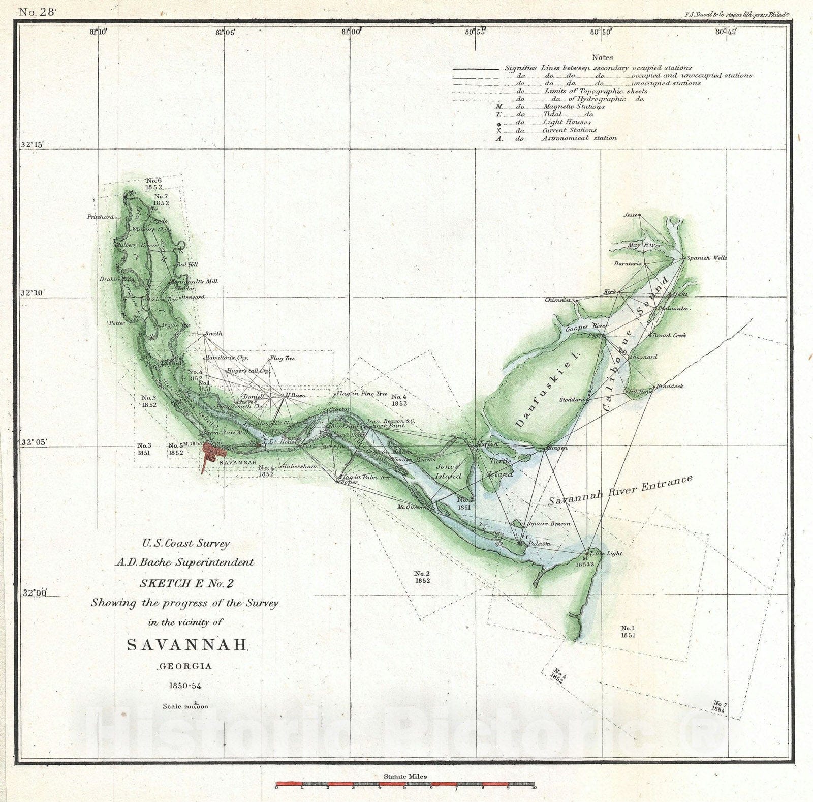 Historic Map : Nautical Chart The Savannah River ans Savannah, Georgia, U.S. Coast Survey, 1854, Vintage Wall Art