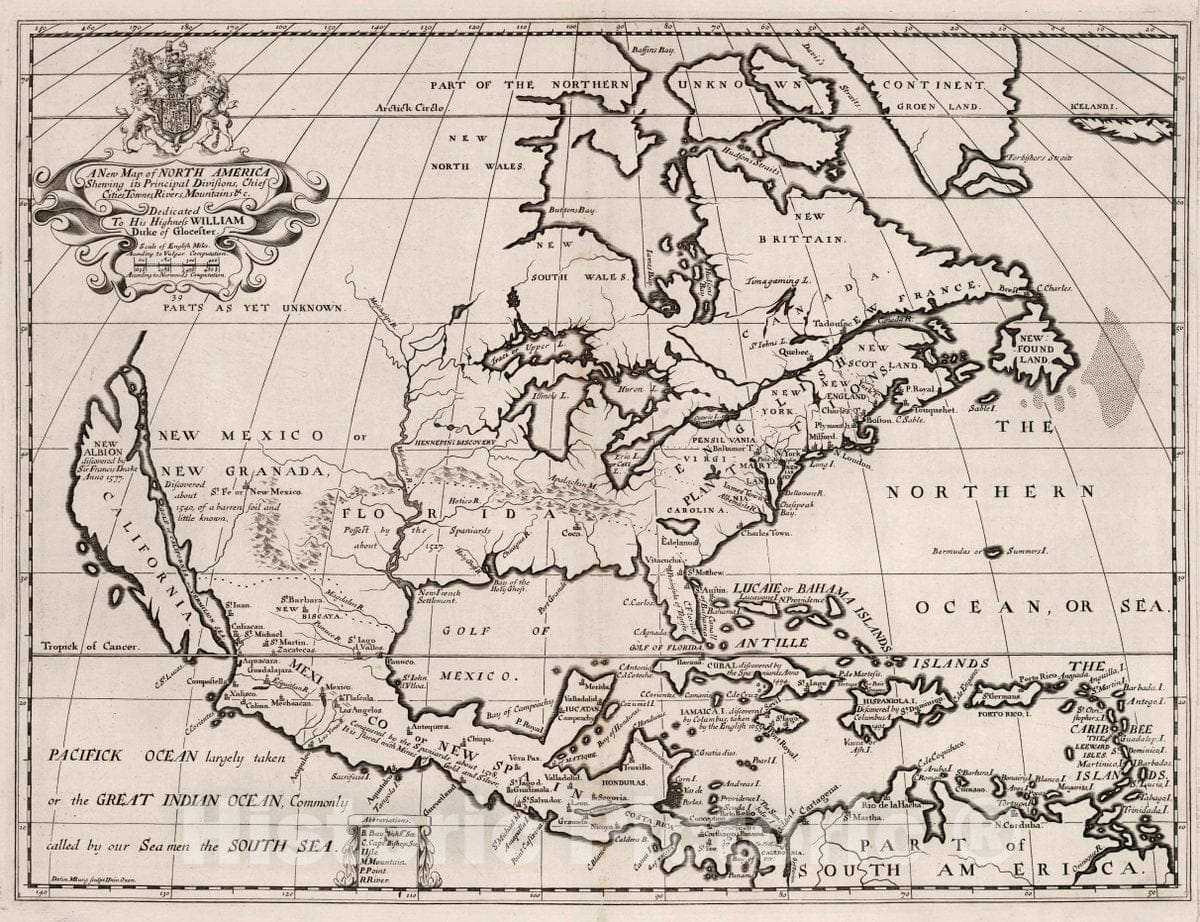 Historic Map : A New map of North America shewing its Principal divisions, Chief Cities, Townes, Rivers, Mountains, 1700 Atlas - Vintage Wall Art